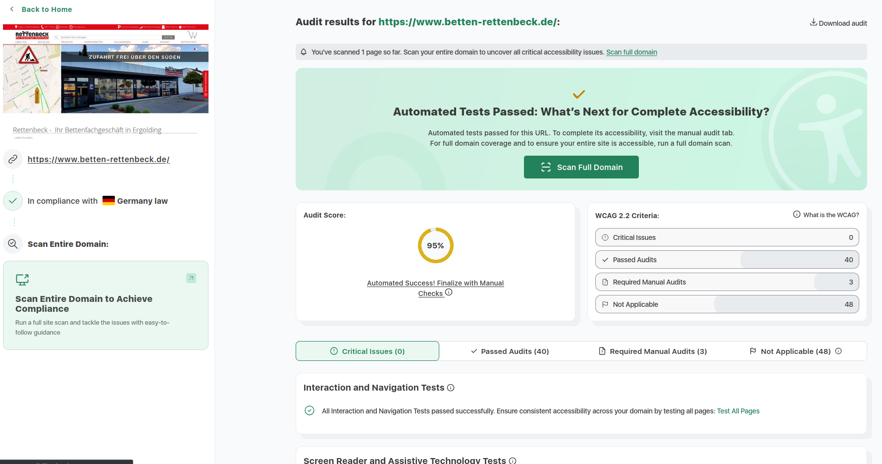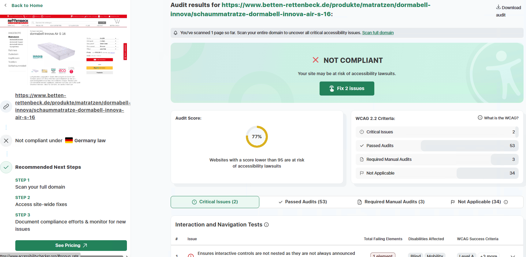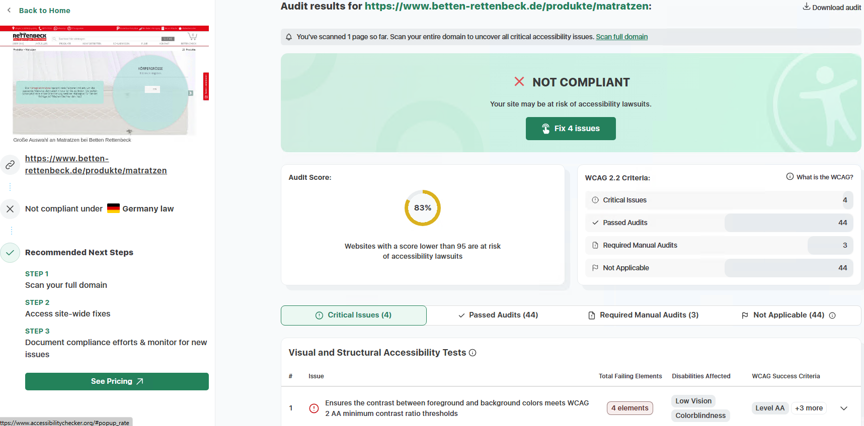 Zur Veranschaulichung unserer kontinuierlichen Überprüfungen der Barrierefreiheit haben wir Ergebnisse aus dem etablierten Tool accessibilitychecker.org dokumentiert. Diese Screenshots illustrieren exemplarisch identifizierte Barrieren sowie die erzielten Fortschritte. Im Folgenden finden Sie drei ausgewählte Screenshots solcher Prüfungen: